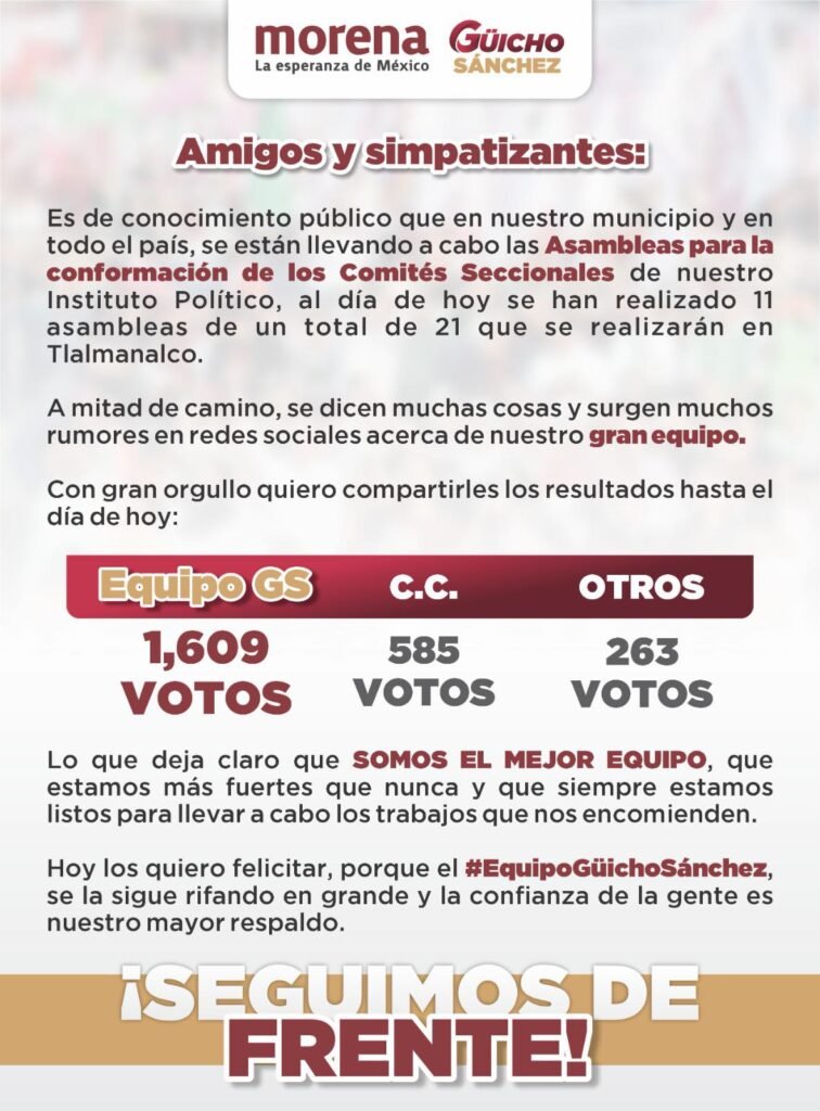 Según el comunicado difundido por la presidencia municipal, los resultados parciales en Tlalmanalco muestran 1,609 votos para el grupo identificado como “Equipo Güicho Sánchez”, frente a 585 votos para C.C. y 263 votos para otros participantes. Estas cifras, difundidas por el gobierno municipal, se interpretan por sus simpatizantes como un respaldo al proyecto del edil.